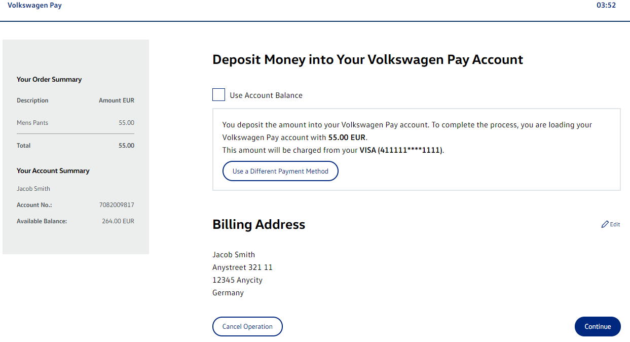 The order summary lists a description of all order items with the respective amount and the resultant total amount to be paid. Additionally, a short account summary with the individual account number and the available balance is shown.
