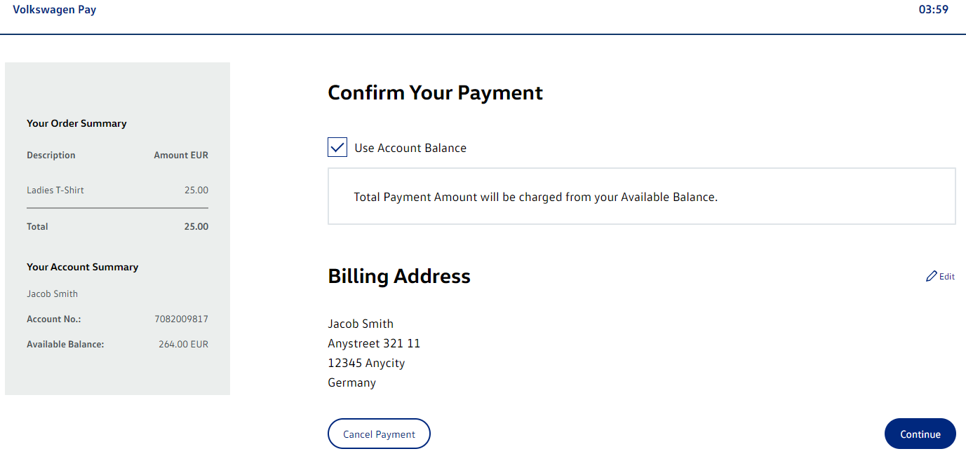 The order summary lists a description of all order items with the respective amount and the resultant total amount to be paid. Additionally, a short account summary with the individual account number and the available balance is shown.