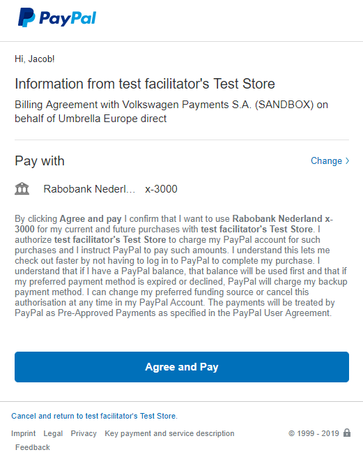 Following this, the Welcome back page shows a billing agreement. Clicking the accept-button, the customer authorizes you to debit the chosen payment option via the PayPal-account.